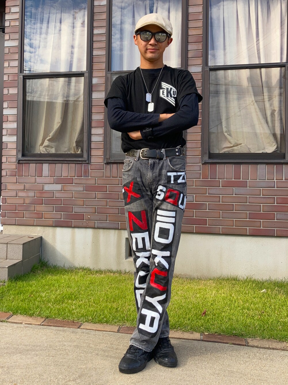 ハンドメイドファッション👀 上下どちらも元々は普通の黒いTシャツに黒のジーパンでしたがどちらもリメイクして新しい姿に生まれ変わりました😊 分かる人は分かりますがTWICEのツウイちゃんのウアハゲの時の衣装を作りました✨