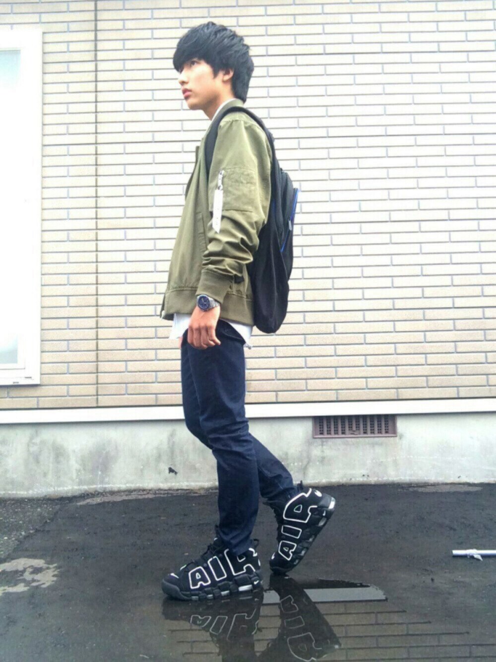 おっはよ〜😁 今日は全身コーデ載せるで✌︎✨ 今日『君の名は。』観るために6時半に起きた(笑)←気合入ってます🚗💨💨💨💨ぶっぶー てかその映画館に向かうためのバスで編集してるだけど既に酔ってる🌀笑 🌟今日のPoint🌟 秋の主役MA–1を取り入れてるのでモード系が強くなります!なので緩和させるために白シャツ&首元のボタンもせめてキレイ目をプラス🔥 あとはシルエットを綺麗に見せるためにデニムのスキニー👍普通のスキニーだとトップスと質感が似てしまうのであえてデニムにします!! 💯今日のPoint💯 今日のPointは何と言ってもNIKE Air more uptempoのスニーカー✨ こんな可愛い靴は滅多にない!!黒白だからなんにでも合わせれまーす🙌ばんざーい(笑) 〜豆知識〜 ・つま先部分のスウォッシュの周りに黒刺繍がない。 ・靴紐を通すプラスチックの部分が光沢を帯びている。 ・大きなAirの文字と靴紐の幅が近すぎる。 ・スウォッシュがバンドで隠れていない。 など色々偽物の特徴があるので皆さん自分の目で確かめて買ってくださいね!!お高いですからボソボソ(笑) というーことでそろそろバス停🚏に到着するのでまた今度〜😁ばいばーい👋