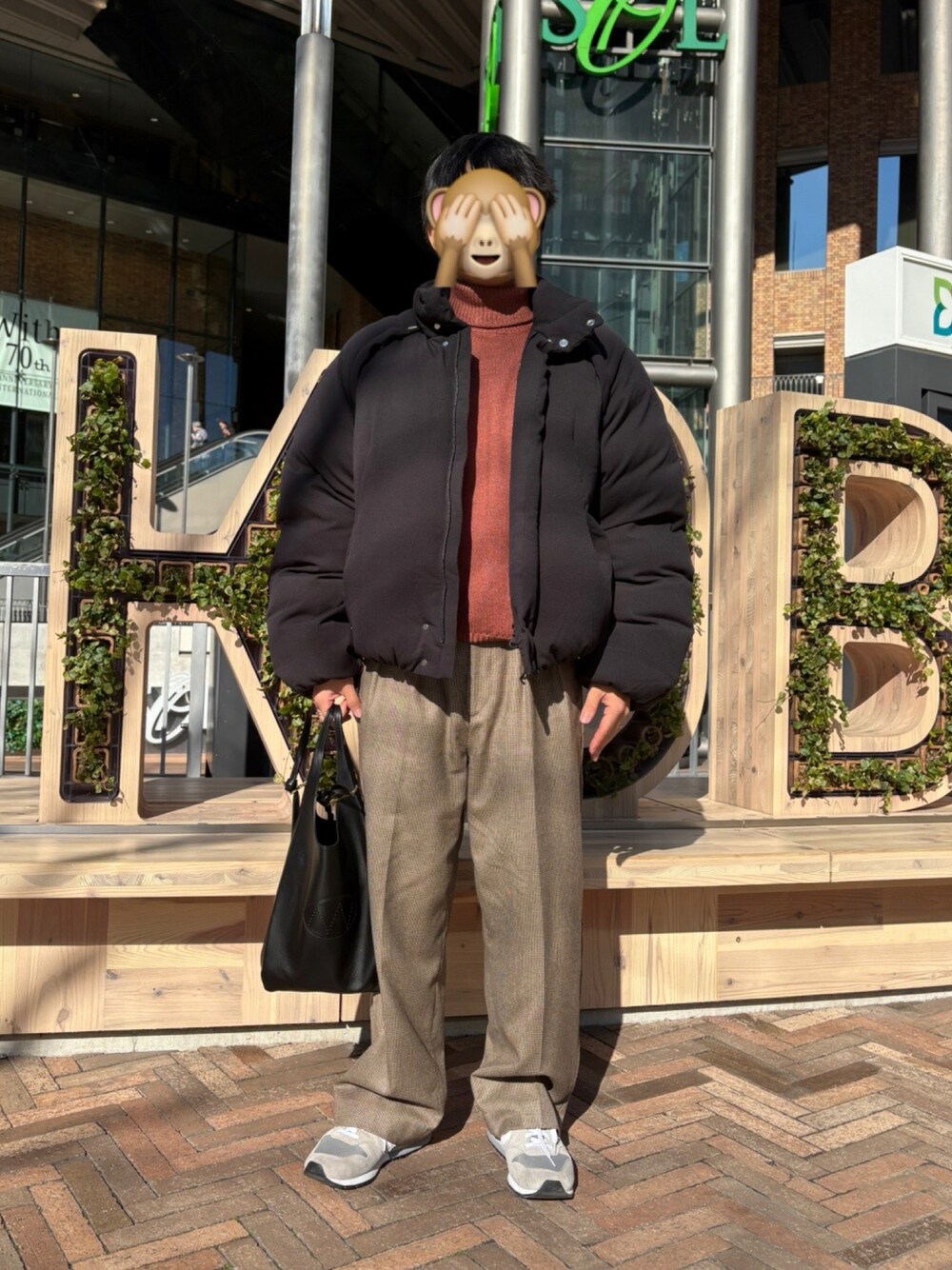 今期ジェイラルのダウンにナイスネスのワイドスラックスを合わせてた大人カジュアルコーデ👖 インナーに赤レンガ色のタートルを入れて アクセントを付けてみました😌 #ナイスネス #ニューバランス