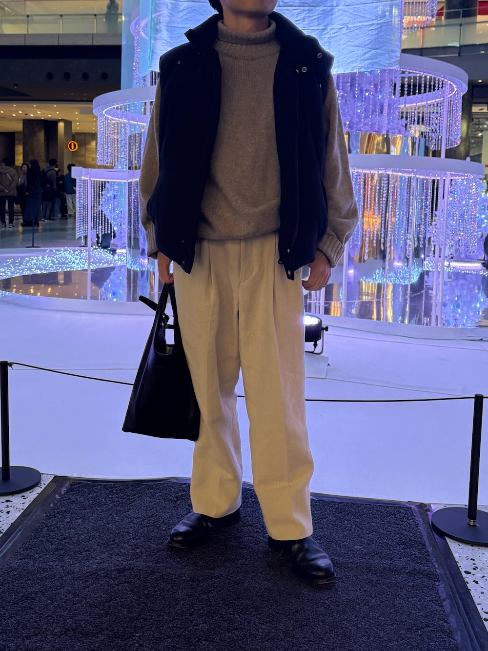 ベージュのタートルネックニットと黒のダウンベストを合わせた冬先駆けコーデ❄️ マーティーの生成りチノパンがお気に入りです