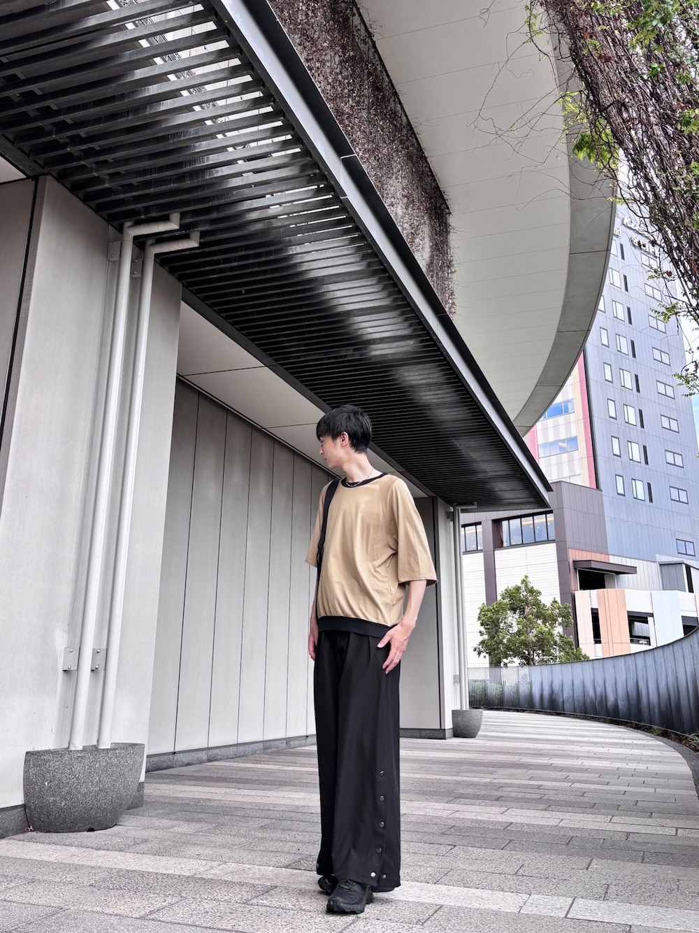 伊勢ゆうたのスラックス「【CLEL】Multi-silhouette loose side button pants/マルチシルエット ルーズサイドボタンパンツ」を使ったコーディネート