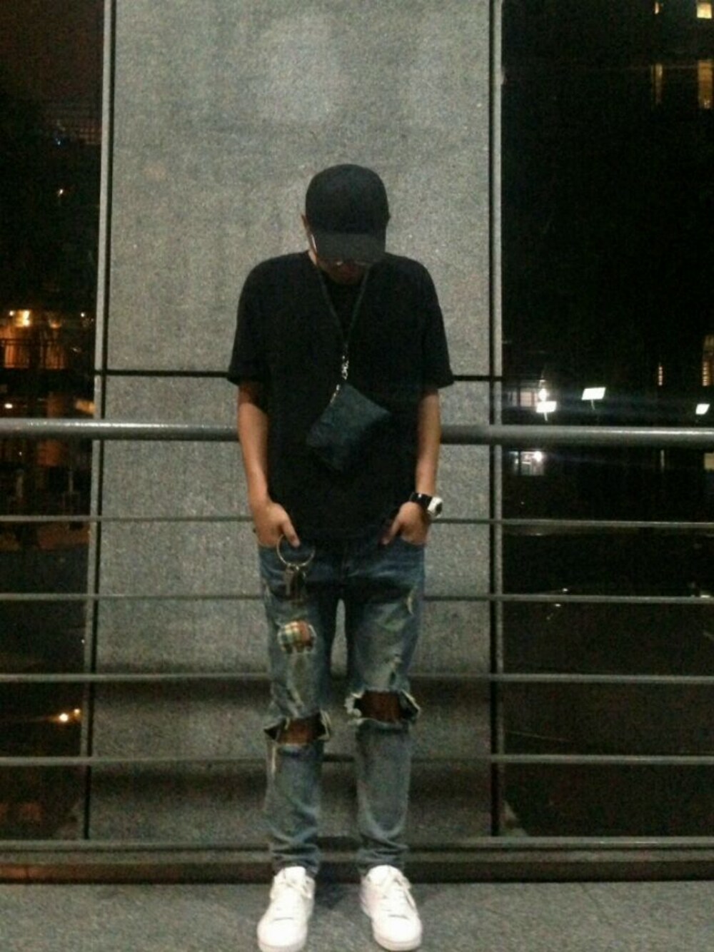 ホワイト系のその他シューズ、ブラック系のTシャツ/カットソーを着用したメンズの秋コーディネートの1枚目の写真