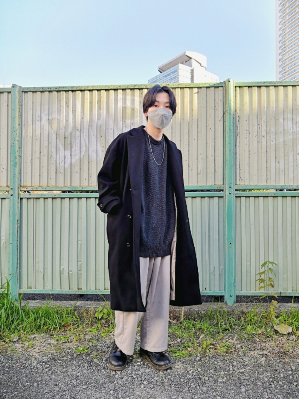 チャコール×ライトグレーのグレーコーデ😎 落ち着いた雰囲気を出したいので 黒のオーバーコートでゆるカッコよく✨