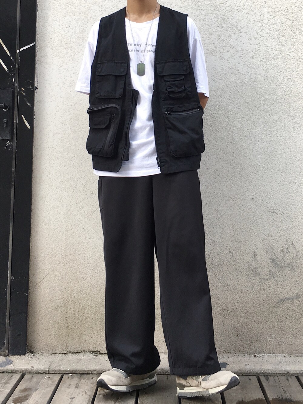 👕:黑色多口袋机能马甲内搭简约白t桖 👖:FSWW插袋阔腿西裤 👟:NB998元祖灰配色 帽:unknownworld 适合夏日的休闲装全身一look,较为稳的一身黑白搭配,马甲多口袋出行很方便,在匡威盛行的时期来双NB搭配也很有感觉,西裤面料凉爽适合夏天,侧标也很有感觉,较为百搭的一条裤子.#今天穿这样#