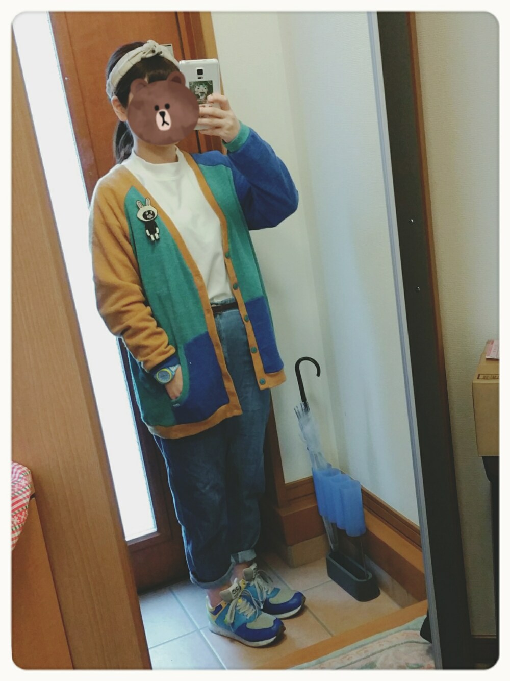 カーディガンとスニーカーの 配色が同じなところが気に入っている☺ カーディガンにつけたワッペンは 新作のうさぎになったにゃー🐰😺
