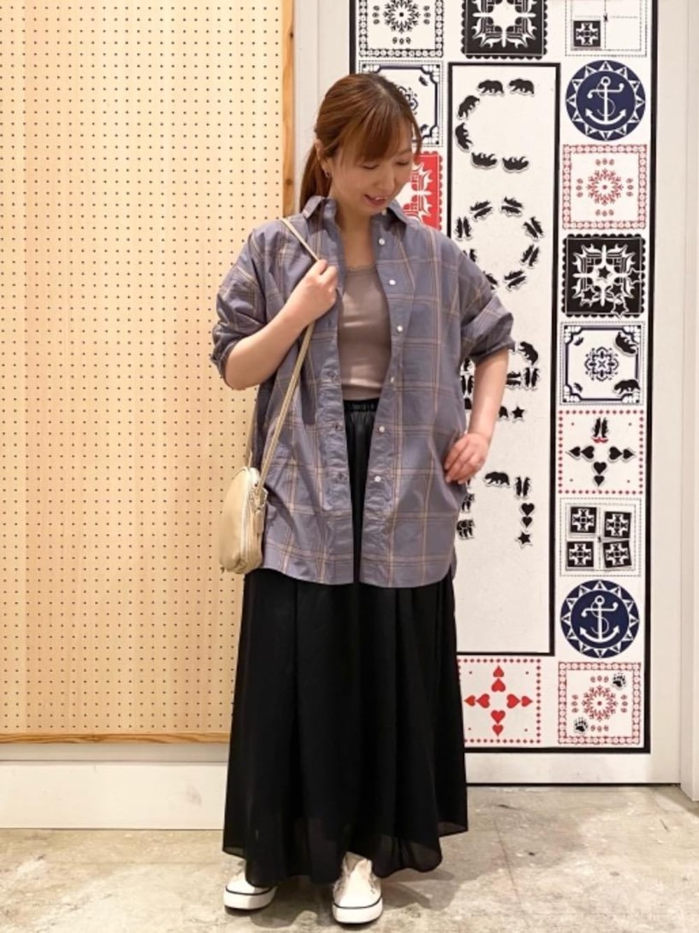 シャツはオーバーサイズなので、サラッと前開きで羽織って合わせました。 スカートで合わせるとフェミニンカジュアルな雰囲気にまとまります。 ボタンを閉めて、スキニーパンツと合わせるのもオーバーサイズなデザインをバランス良く見せてくれるのでオススメです! 商品名:USAコットンチェック柄羽織シャツ サイズ感:オーバーサイズ 素材感:ハリのある綿素材