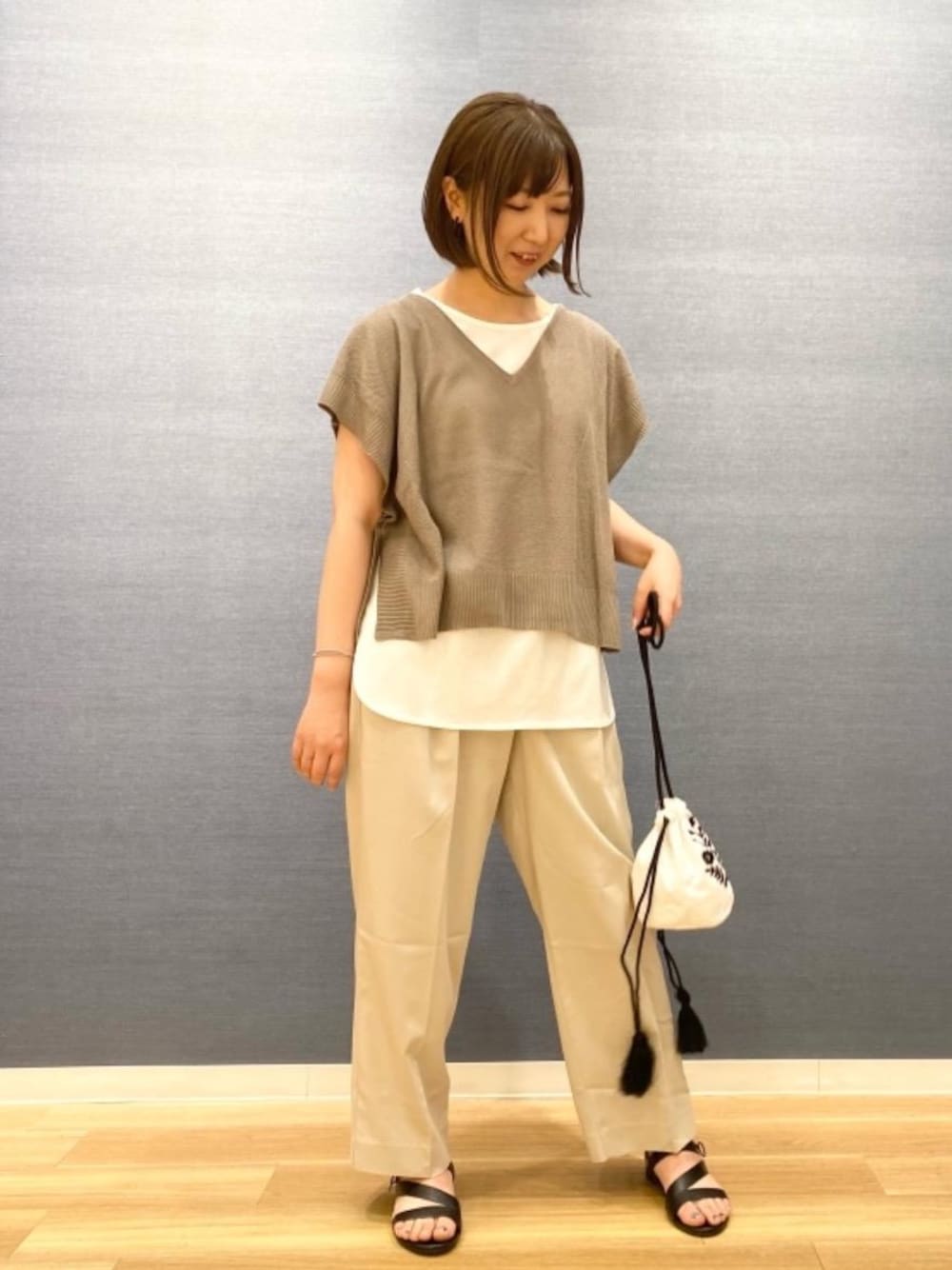 涼しげなカラーの組み合わせでコーデしました。 ベストが麻のような質感で涼しげな雰囲気になります◎ 商品名:【2セットアイテム】麻ライククロップドベスト×Tシャツセット サイズ感:ゆったりサイズ 素材感:風通しよく涼しげな素材感です