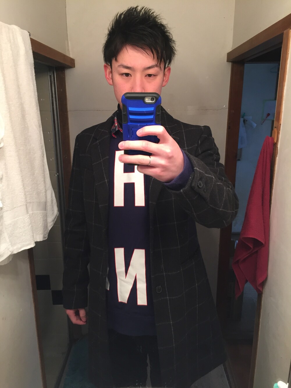 ゆるめのトレーナーに 流行りのチェスターコートを 羽織ってみました(*^_^*)