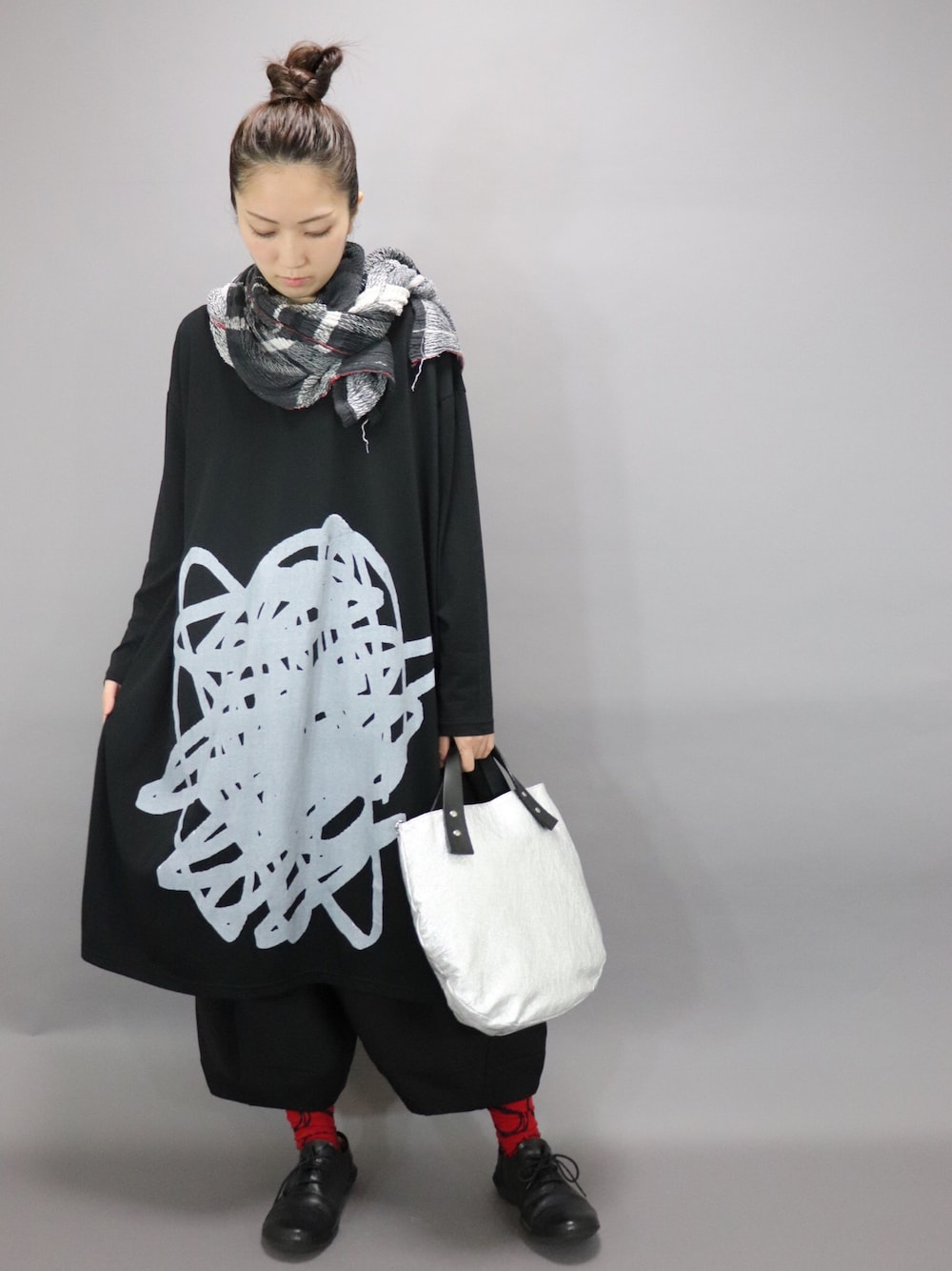 モノトーンでコーディネートしてみました✨ ゆったりしていますが、キリッとしてかっこいいですよ😎 シルバーのバッグはモノトーンとよく合いますよね。 ストール【tamakiniime】¥20520 チュニック【moyuru】¥19440 ワイドパンツ【moyuru】¥25920 靴下【moyuru】¥2052 バッグ【cahella】¥25920