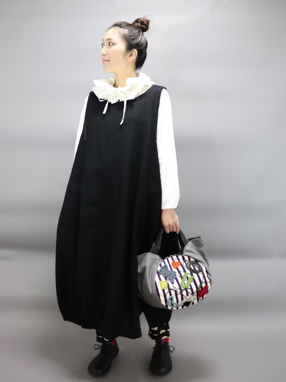 フワッと軽いウールのジャンパースカートをコーディネートしてみました。 えり、足元、バッグでアクセントを付けています✨ インパクトのあるバッグは、 無地の服に合わせるといい感じですよ👌 ウールのジャンパースカート【if coulage】¥28080 ワイドパンツ【cotton house aya】¥17280 バッグ【ale’x】¥19440