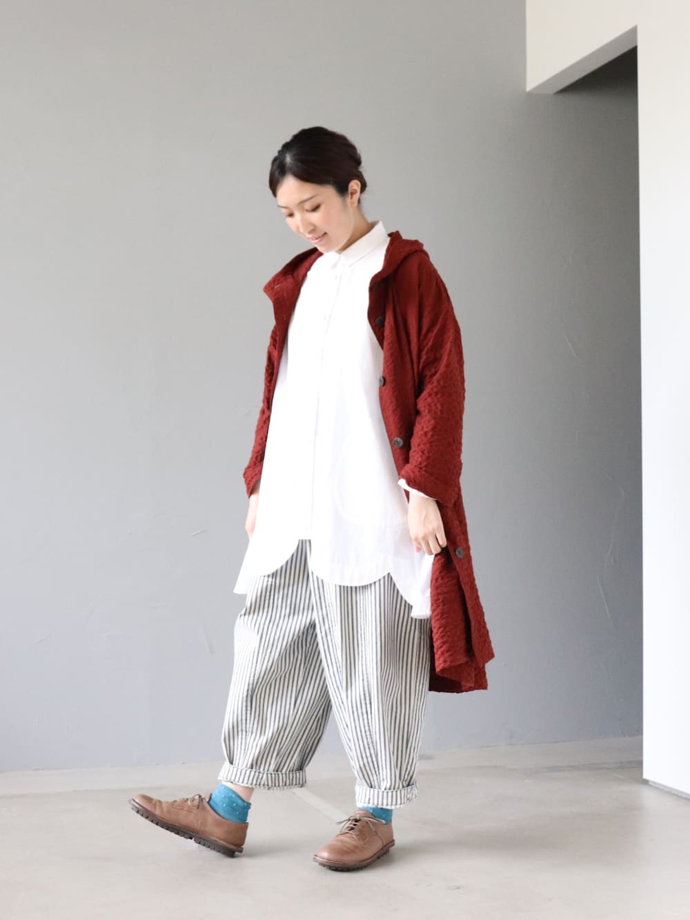 秋色の柔らかい羽織りものを 着てみました。 ブラウスのモクモクしたすそが ポイントです。