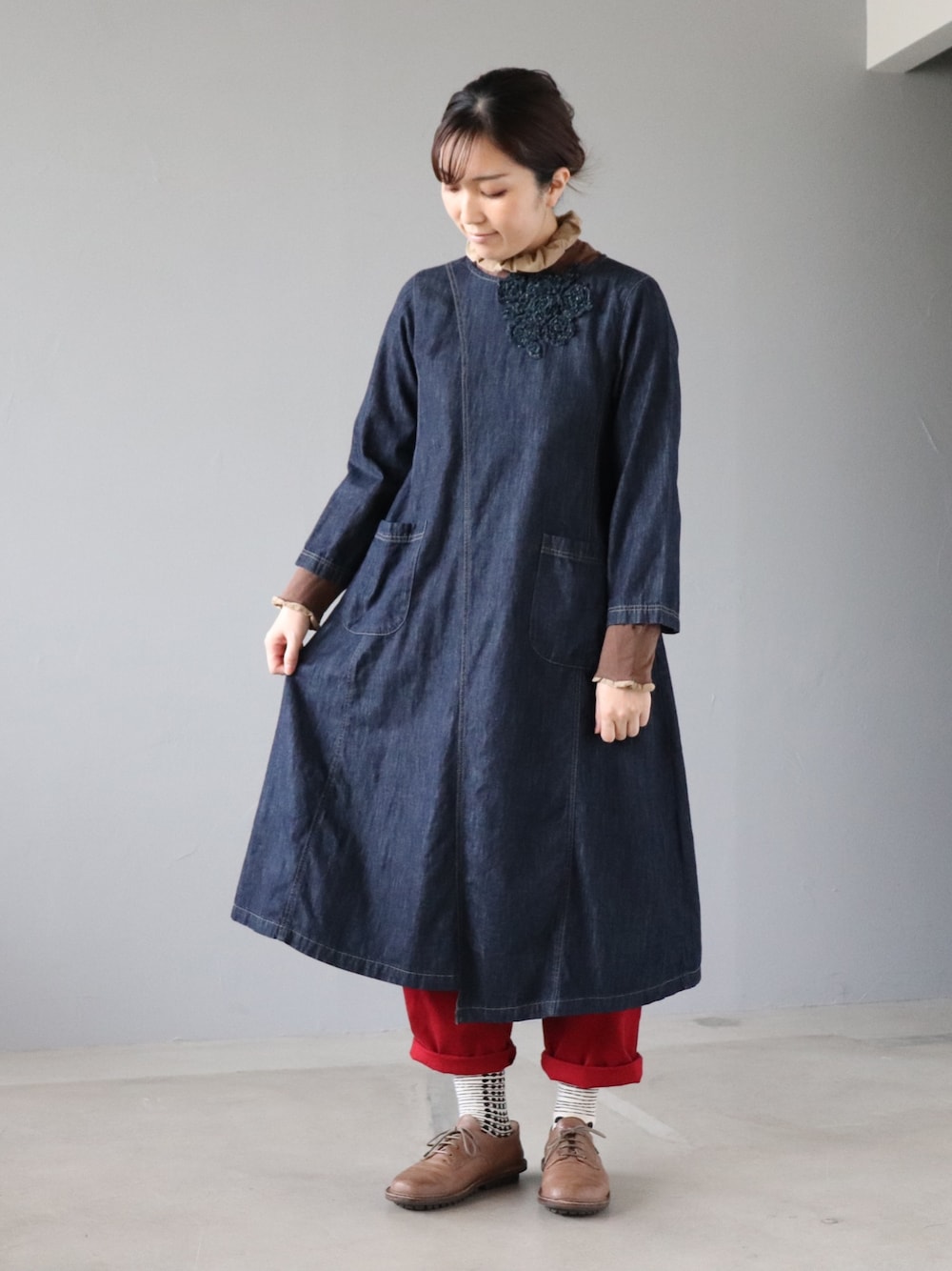 デニムのワンピースから コーデュロイのハイネックを ちょこんとだしてみました。 パンツの赤色でアクセントを。