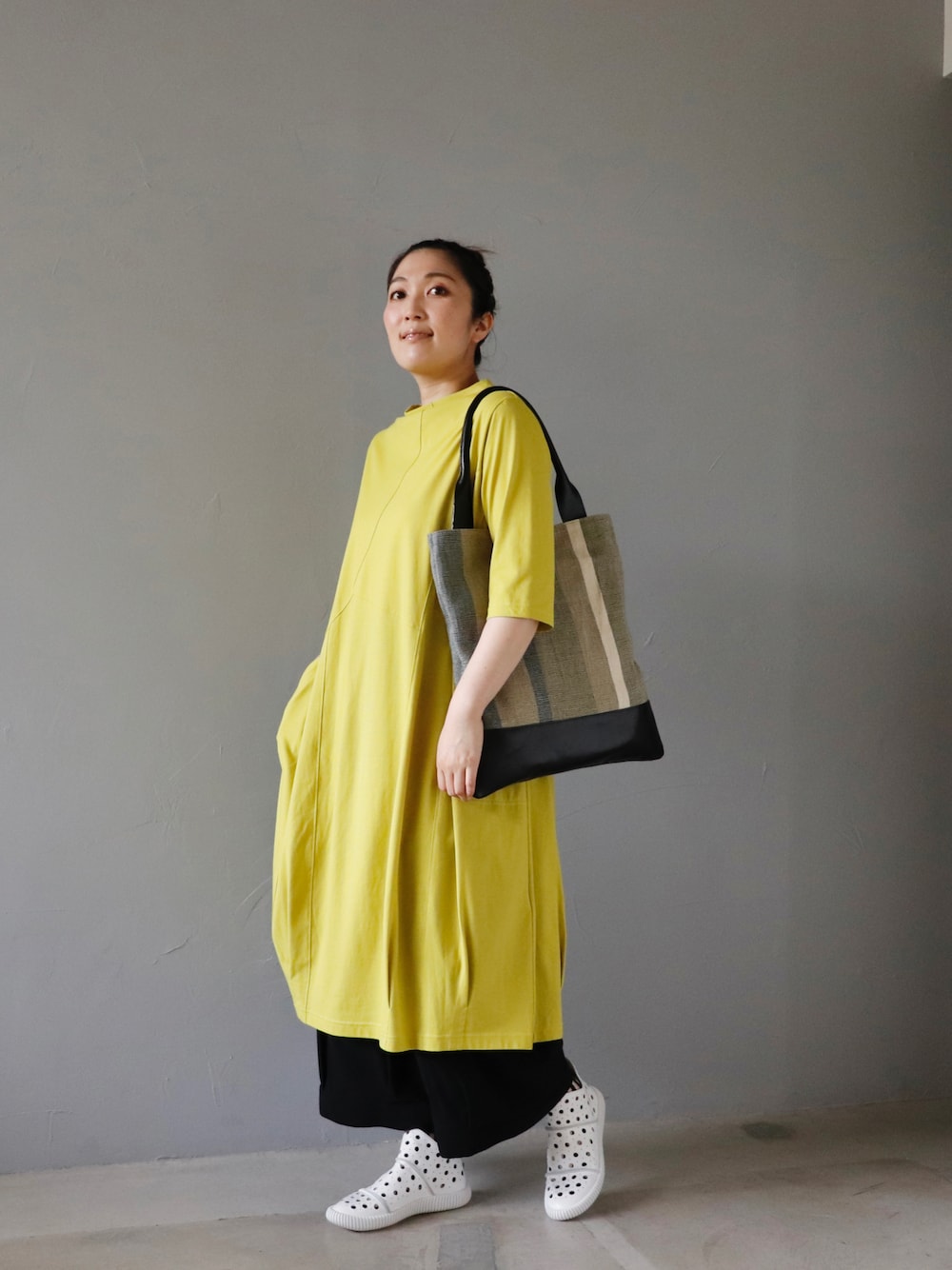 そのときにある店頭の洋服で コーディネートしたものを お届けしています。 『ふらっと歩いてる街で ふと、ショーウインドウに 目を向けると、』 そんなイメージで ご覧いただけましたら うれしいです。 ---------------------------- ショーウインドウは、いつも vol.092 1. きいろの涼しいワンピース 〈coulage〉 ¥22,000 着丈 101cm 身幅 56cm(ぐるりで112cm) 綿 100% 2. ZIPANG特注 『カボチャパンツ』〈黒〉 〈DAVODAVO〉 ¥19,800 ↑ 近日、オンラインショップに 入荷予定です 3.ジュートのバッグ 〈ikot〉 ¥17,600 4. ワイドパンツによく合う レザーシューズ 〈de ocho A de ocho〉 ¥15,180 (全て税込価格です) ---------------------------- スタッフの身長 161cm 取り扱い店舗のご確認など、 お気軽にお問い合わせください。