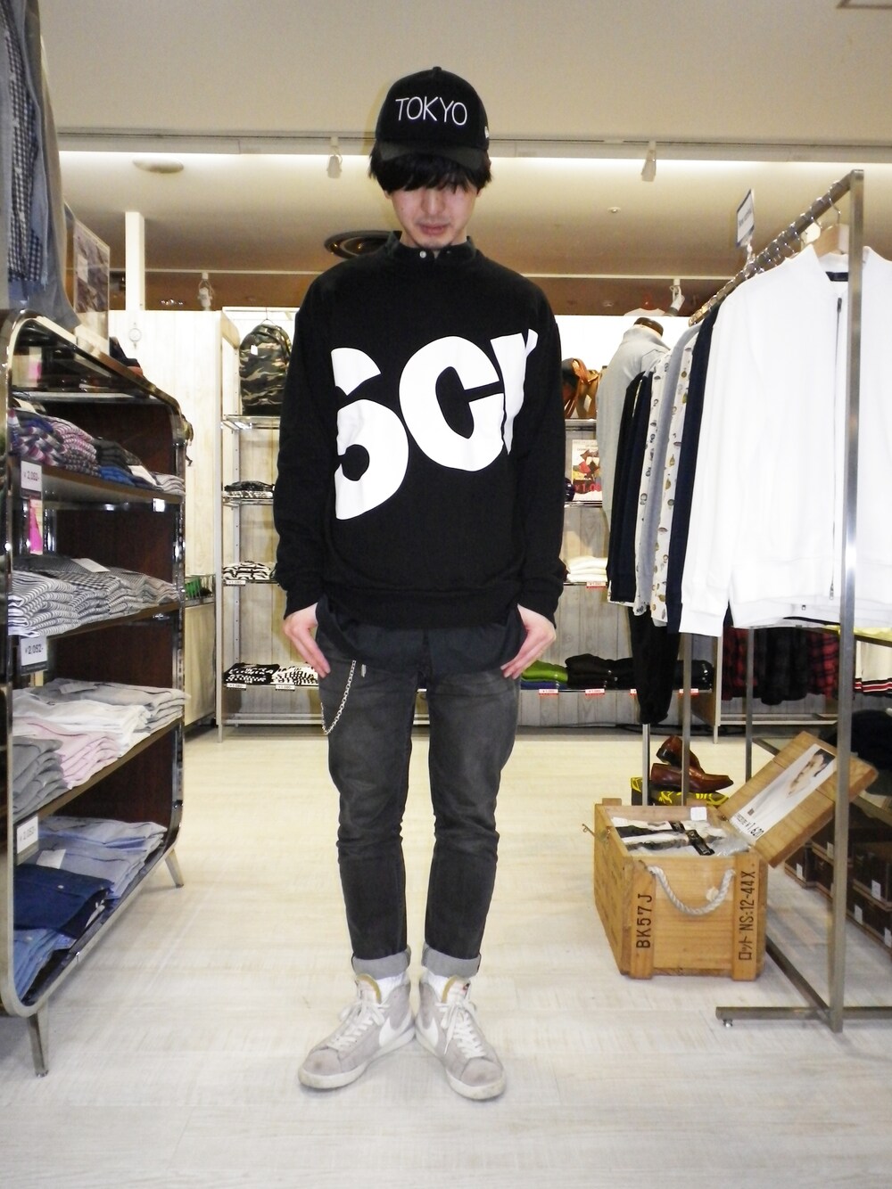 ブラックのビッグシルエットのスウェットとスキニーでワントーンのストリートっぽいコーデにしてみました。インナーには同色のロングシャツを合わせています。パンツはスキニーで上下のメリハリをつけ、足元はハイカットスニーカーでボリュームを出しています。