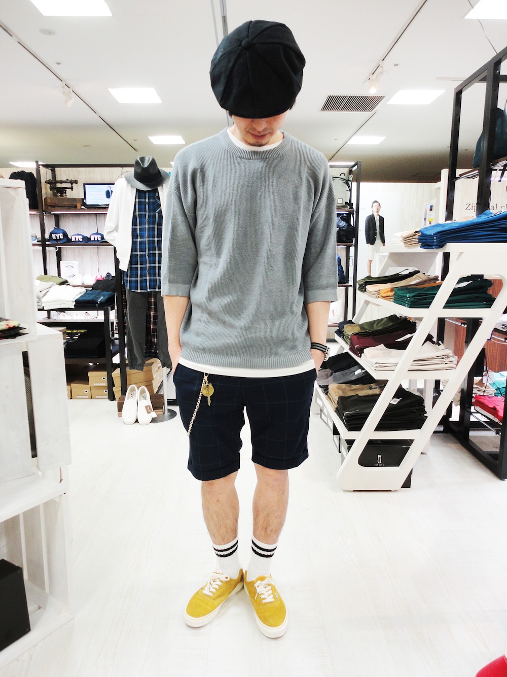 リニューアル準備やSALEでバタバタしてましたので久々の更新です。 什器が変わったのでお店の雰囲気が良くなりましたよ♪ オーバーサイズでドロップショルダーになった綿麻のニットをスーツ地のショーツで合わせたきれいめなサマーコーデです。 これに革靴だと面白くないのでスケーターソックスにVANSのERAを合わせてハズしてみました。