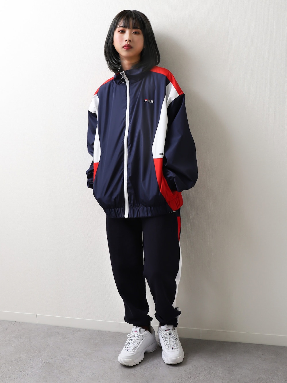 ZIP FIVE【Official】(ZIP FIVE)のブルゾン「【FILA】 ワンポイント ロゴ 刺繍 切替 ナイロン トラックジャケット」を使ったコーディネート