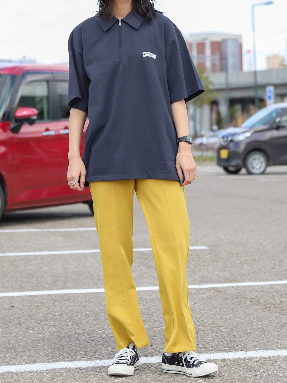 ZIP FIVE【Official】(ZIP FIVE)のポロシャツ「【ZIP FIVE】ハーフジップ オーバーサイズ ワンポイント 半袖Tシャツ/ポロシャツ」を使ったコーディネート