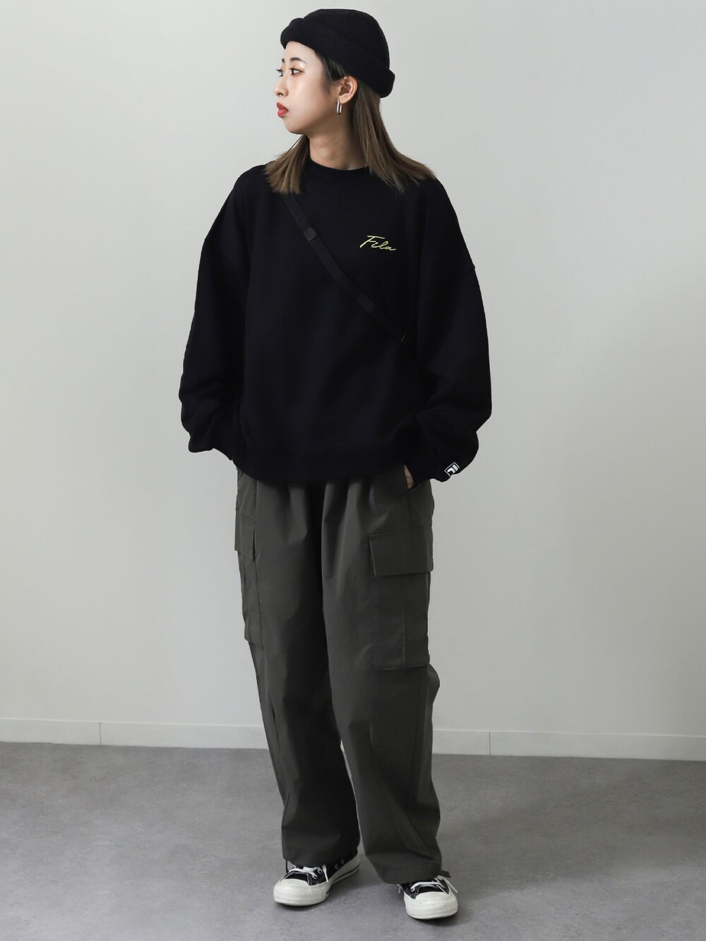 【WEB限定】【別注】【FILA】 ビッグシルエット ドロップショルダー裏毛左胸ロゴトレーナーを使ったコーデです! スポーツウェアブランド【FILA】より、ワンポイントロゴをあしらったクルーネックスウェットが登場。 カレッジロゴ風のブランドロゴや筆記体調のロゴ刺繍を施し、シンプルながらもデザイン性の高い一枚に仕上がっています。 袖口部分にブランドイニシャルのロゴを施し、さり気ないアクセントをプラスしています。 オフィシャルInstagramやTwitterにて最新情報や限定情報を毎日更新中! Instagram:zipfive.official