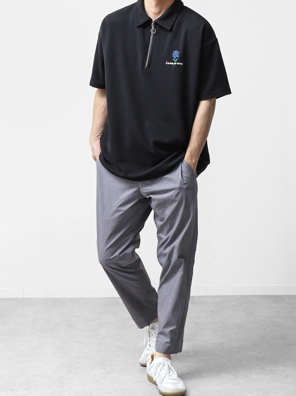 ZIP FIVE【Official】(ZIP FIVE)のTシャツ/カットソー「【_gram.】 ジャガード ワンポイント バラ ローズ 刺繍 ハーフジップ 半袖Tシャツ」を使ったコーディネート