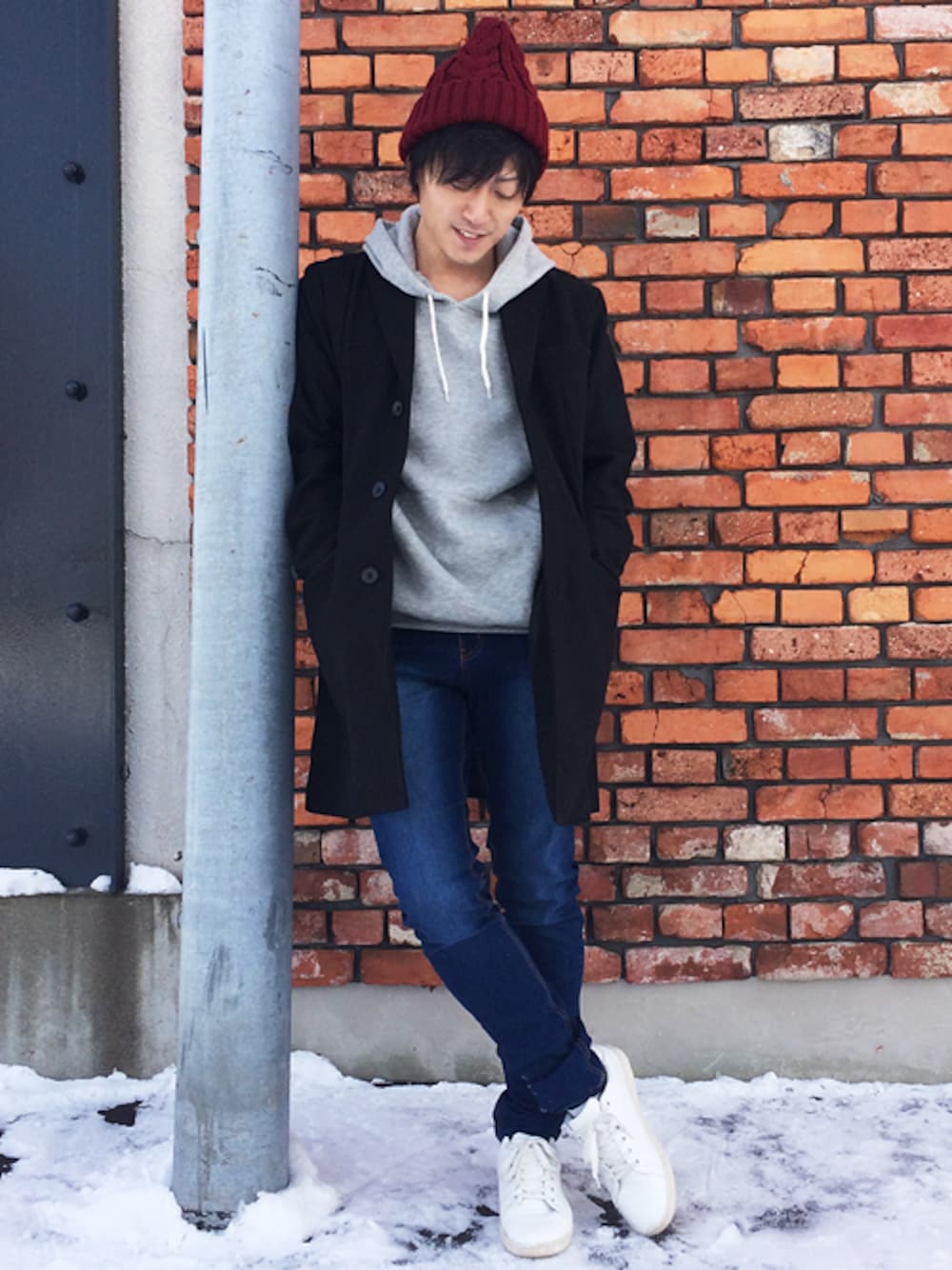 今日の気分はこんな感じコーデ きっちりチェスターとカジュアルを合わせて。 アクセントになるかなぁと思いワインのニットキャップ。 最近ホント寒くて。。でもなかなか良い天気で空気が澄んでる気が。 こんな日は、遠くを見てちょっと深呼吸すると、一瞬仕事の忙しさが紛らわせれます。 。。。写真の電柱ちょっと傾いてないかな? ご覧いただいた皆様ありがとうございました。