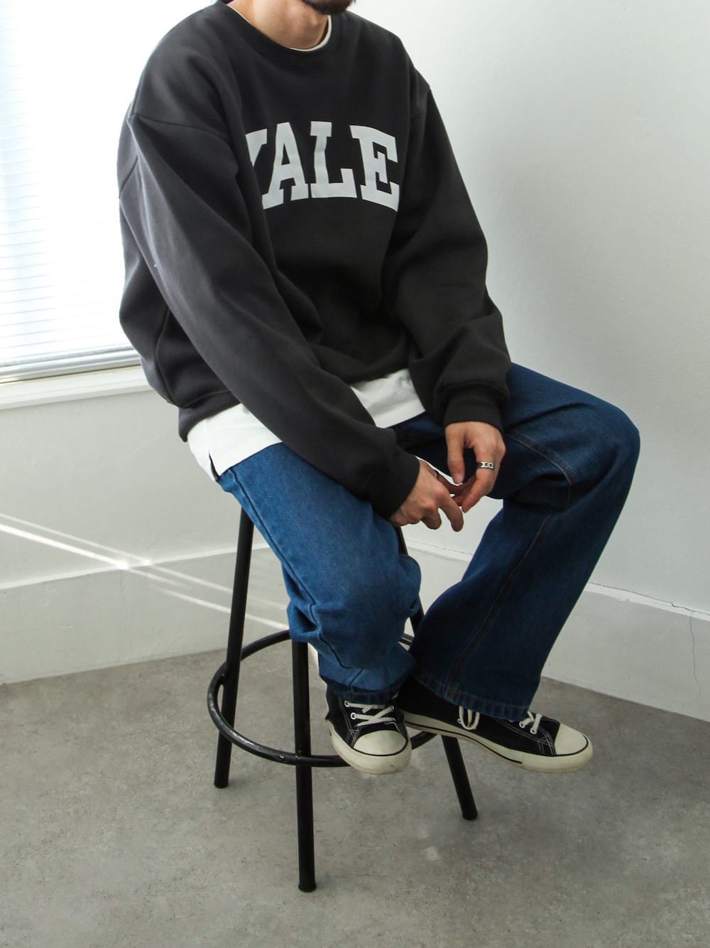 KONのスウェット「【別注】【YALE】 カレッジロゴ ビッグシルエット クルー 長袖 スウェット トレーナー / 白 / グレー」を使ったコーディネート