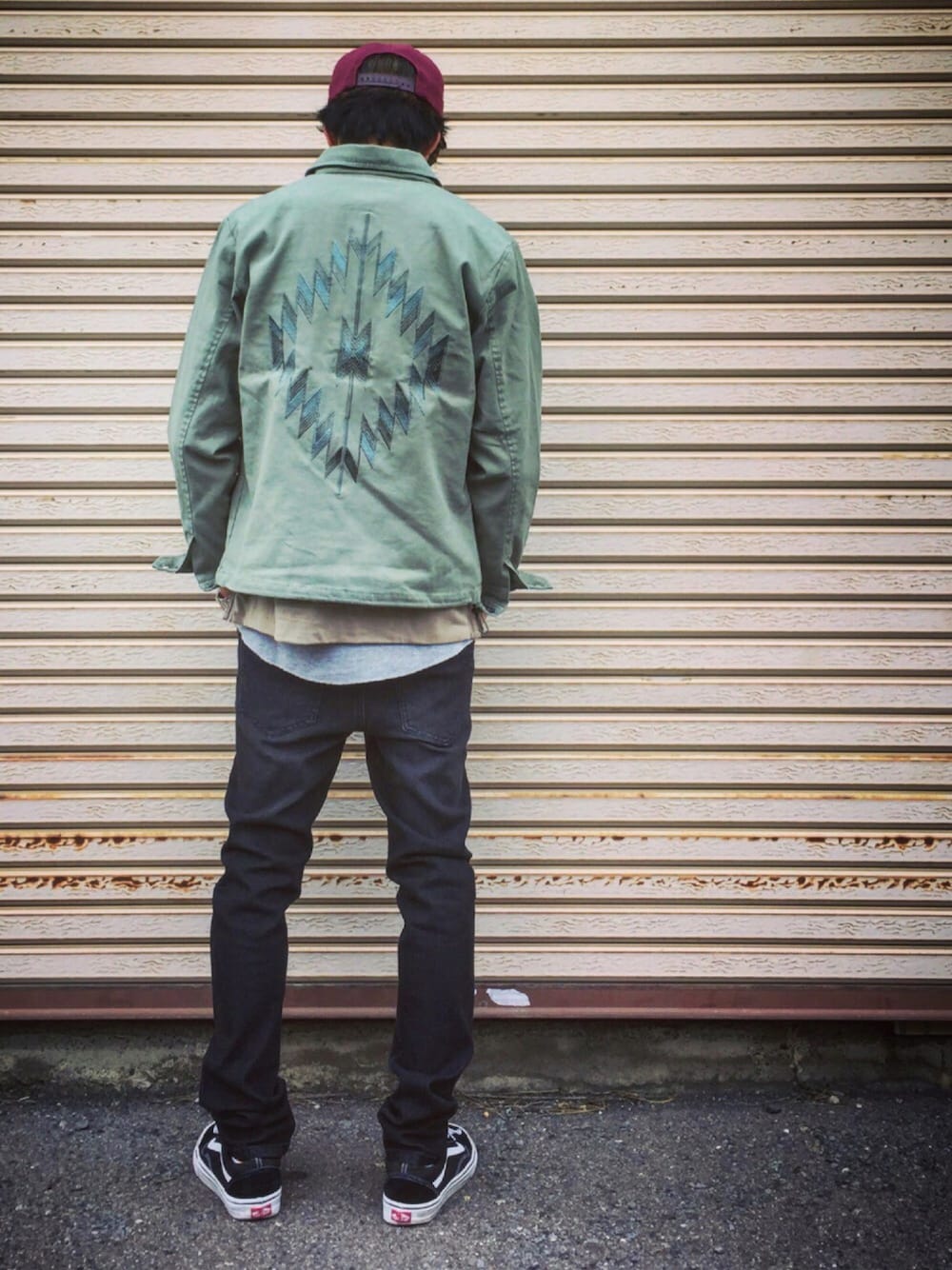 ご覧頂きありがとうございます(^o^)/ 本日は当店デザイナーいわぶちによる渾身のジャケットを使いましたので、後姿にて失礼致します。 この刺繍がたまらなくカッコいいです!! 小窓に正面バージョンも載せましたので、よろしければ見てみてください♪(´ε` )