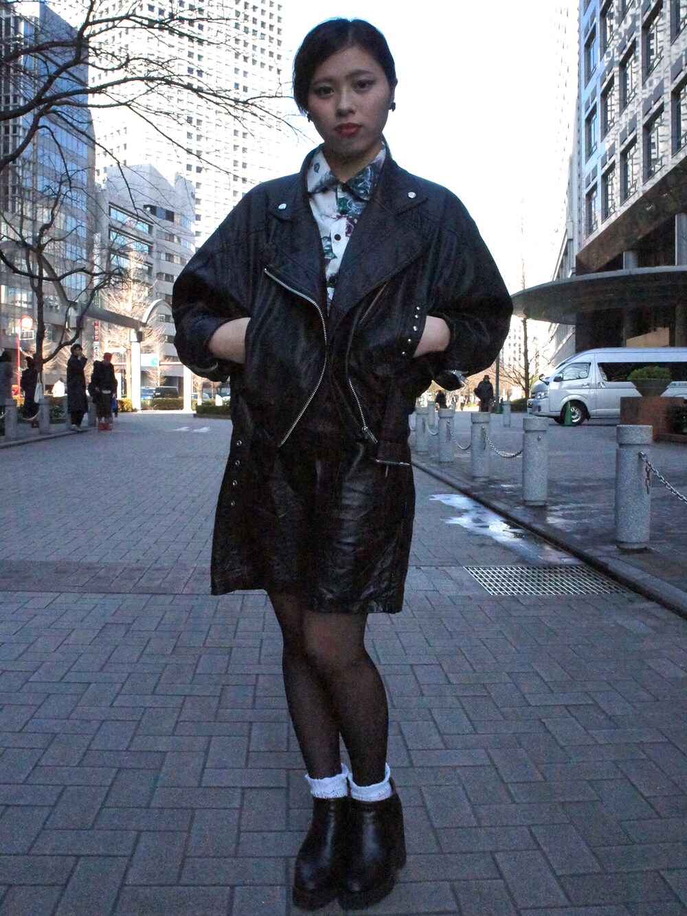 【Zipperスナップin文化服装学院】 ライダース:借り物 ブラウス:あちゃちゅむ レザータイトスカート:ロンドンの古着屋 約2000円 靴下:靴下屋 約1000円 靴:STYLE NANDA 約5000円 ピアス:福岡のアクセサリー屋 約2000円 【西野まどかちゃん/19/ファッション流通科】