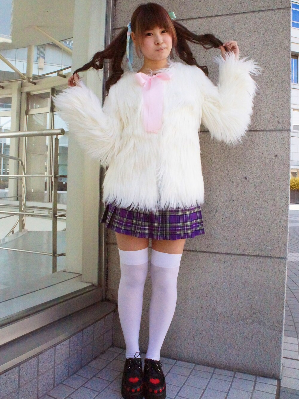 【Zipperスナップin文化服装学院】 ファーコート:NilePERCH 約8000円 プリーツスカート:BUBBLES 約5000円 靴:BUBBLES 約5000円 【白井裕子ちゃん/19/ファッション流通科】