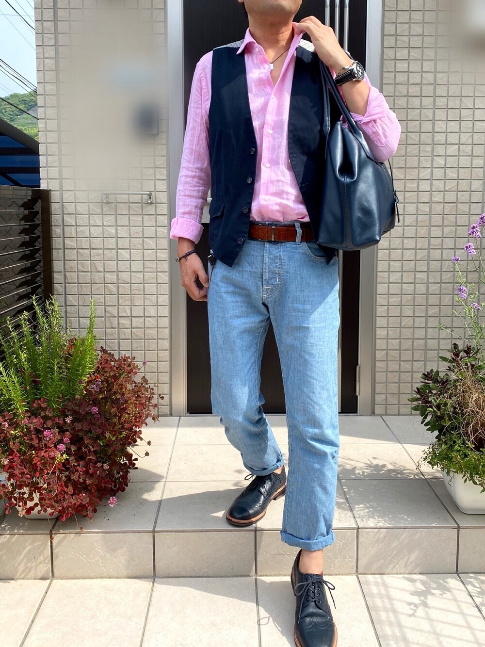 リネンのピンクシャツを着たくて合わせました。 まだ涼しい時間帯にお出掛けです