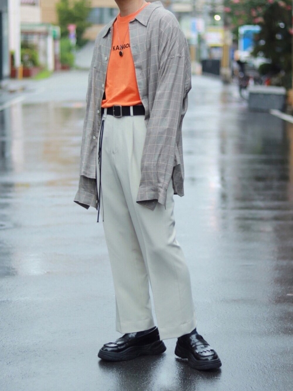 Instagram ☞ ____s_i_n____ 白・グレーベースにオレンジが映えるように🍊 このスラックスについてる紐が良いんだよ、紐が🙆♂️ コスパ良いんでオススメです✨