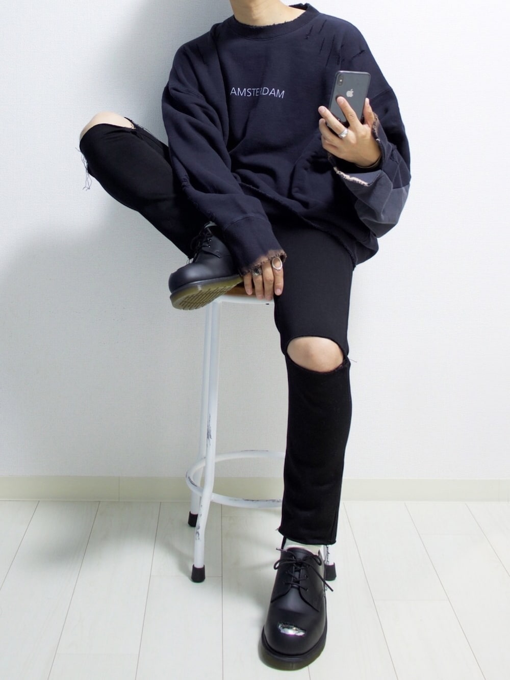 Instagram ▶︎ ____s_i_n____ スウェットコーデ。 ダメージ加工にもセンスを感じる逸品。 キャラ濃いめなトップスの時はシンプルに合わせるイメージ🙆♂️ そろそろ膝出しもさみーなぁ
