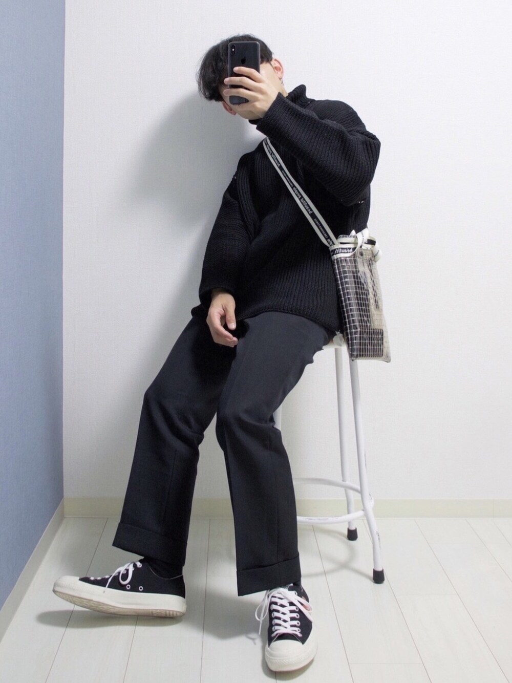 Instagram ▶︎ ____s_i_n____ もう2月ですね😨 時間が流れるのが早い… オールブラックモジモジくんコーデ🙋♂️ ハイネックニットの良さを伝えたくてコート脱いでますが、全然わかりにくくて伝わらないですね笑