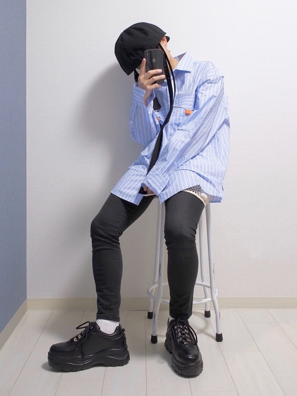 海月帽子🧢 めっかわストライプシャツ オレンジのワンポイントがたまらぬ スキニーひさびさに履いたわ ムチムチ感がイナメナイ Instagram ▶︎ ____s_i_n____