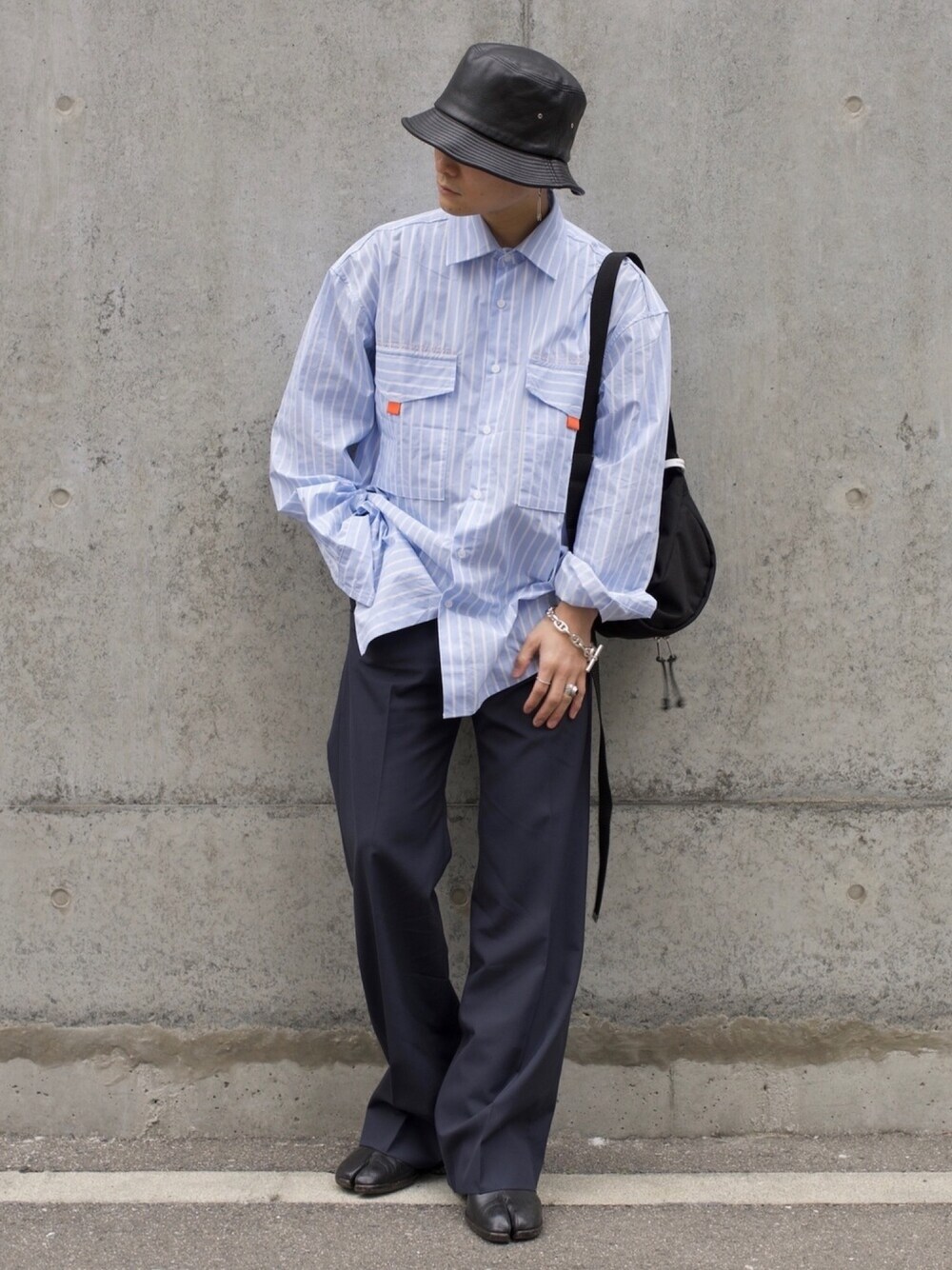 心のシャツ/ブラウス「ロングスリーブビッグシルエットストライプWポケットネオンカラーオーバーサイズシャツ」を使ったコーディネート