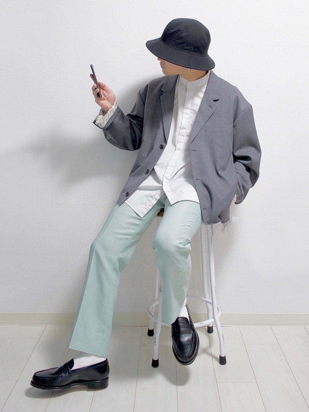 モノトーンとペールトーン💁♂️ バンドカラーのシャツ好きなんですよね〜 襟がないからジャケットの邪魔をしないしなんとなくスタイリッシュに見える このパンツはZOZOTOWNでピックアップしてたやつです🙏 Instagram ▶︎ ____s_i_n____
