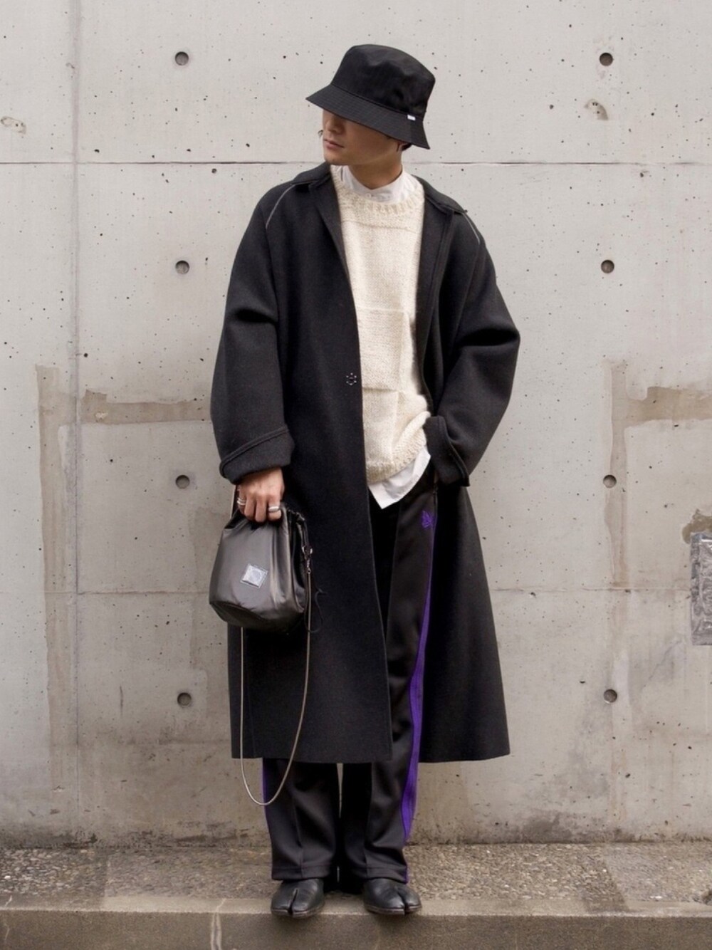 ■コメント 白ニットコーデ。 クルーネックニットはスタンドカラーシャツと合わせるのが好き。 アクセントに紫。 巾着バッグはポリ素材なのでガシガシ使える。 ■サイズ コート 2 ニット 2 トラックパンツ XS ブーツ 40 ■宣伝 インスタは雰囲気変えてるのでぜひ! Instagram ▶︎ ____s_i_n____