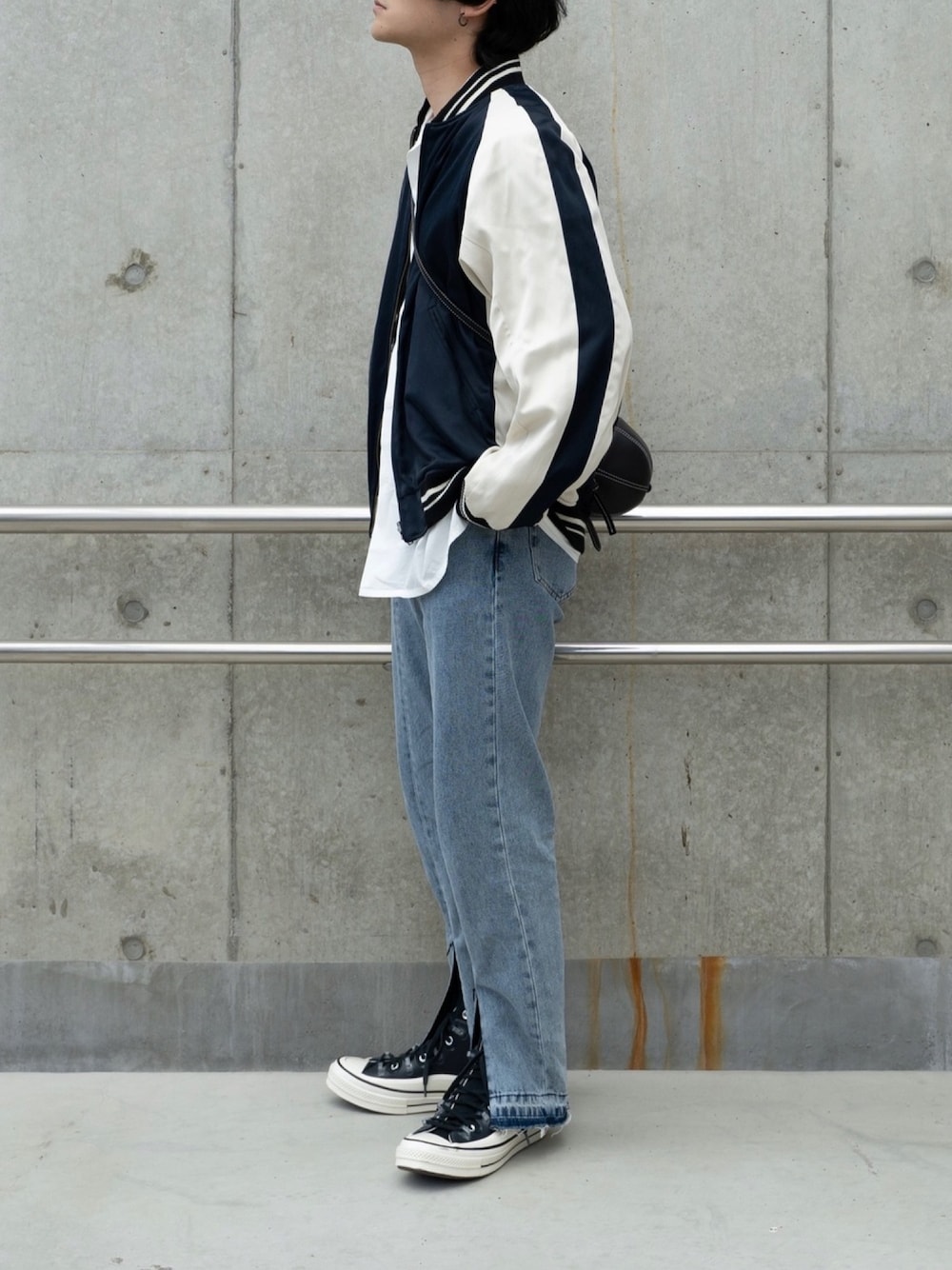 👍低身長に見せないコツ 横向きで撮る 👍コーデのポイント的な スカジャンコーデ デニムがめっちゃよい スカジャン 42 シャツ M パンツ M ■宣伝 インスタ、Tiktokもぬるっと見に来てね Instagram ▶︎ ____s_i_n____ Tiktok ▶︎ ____s_i_n____