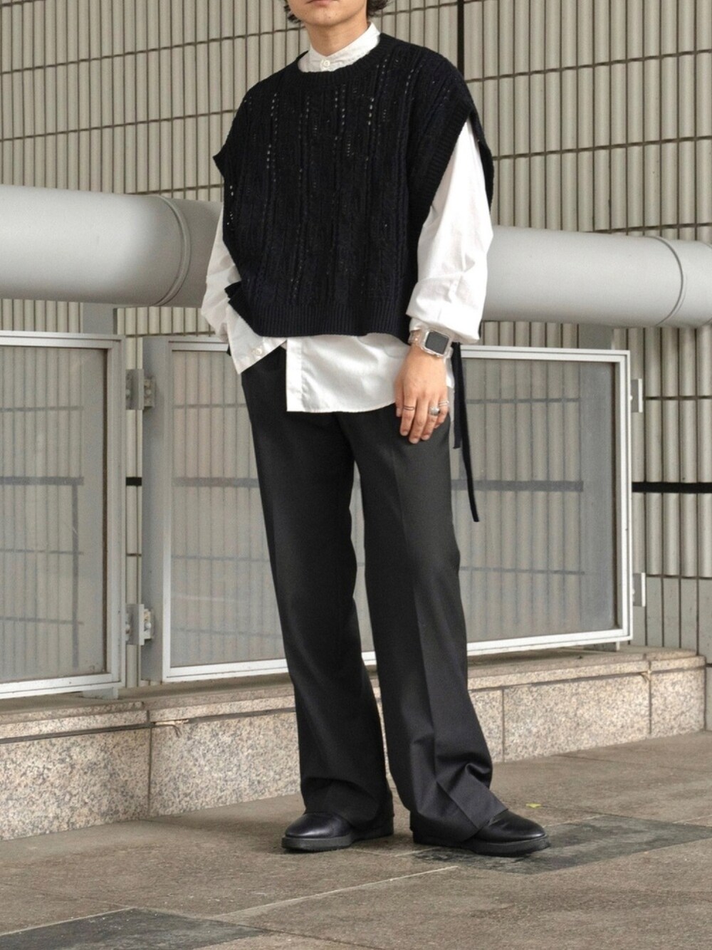 👍低身長に見せないコツ 背景を斜めに写す 👍コーデのポイント的な シャツに透け編みのニットベスト。 unlowの秋冬新作です。 ニットベスト フリー パンツ 1 シャツ S ■宣伝 インスタ、Tiktokも。 Instagram ▶︎ ____s_i_n____ Tiktok ▶︎ ____s_i_n____