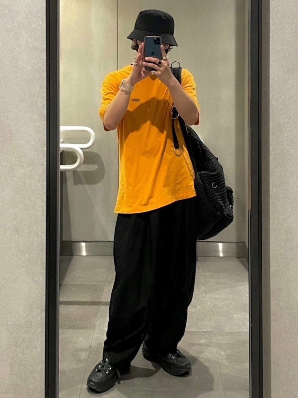 👍低身長に見せないコツ 顎ひいてとる 👍コーデのポイント的な オレンジT最高🍊 Tシャツ S パンツ 42 ■宣伝 インスタ、Tiktokも。 Instagram ▶︎ ____s_i_n____ Tiktok ▶︎ ____s_i_n____