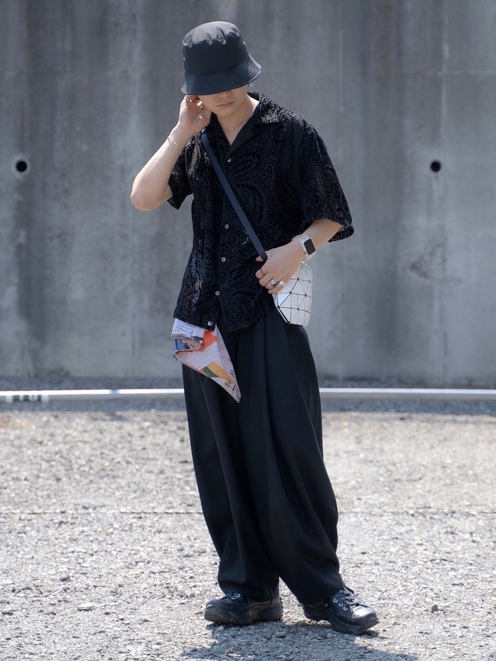 👍低身長に見せないコツ 片足に重心を乗せる 👍コーデのポイント的な 夏のオールブラックスタイル。 透け感のあるアイテムとバルーンパンツで差別化。 シャツ 1 パンツ 42 ■宣伝 インスタ、Tiktokも。 Instagram ▶︎ ____s_i_n____ Tiktok ▶︎ ____s_i_n____