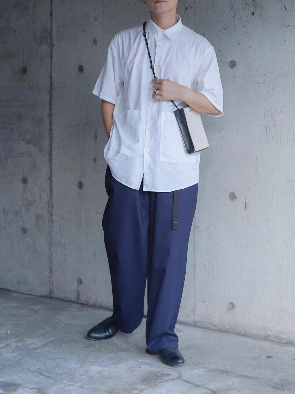 👍低身長に見せないコツ 斜めから撮る 👍コーデのポイント的な 半袖シャツにテーパードスラックス。 白とネイビーで落ち着いた印象に。 Size シャツ 1 パンツ 3 ■宣伝 インスタ、Tiktokも。 Instagram ▶︎ ____s_i_n____ Tiktok ▶︎ ____s_i_n____