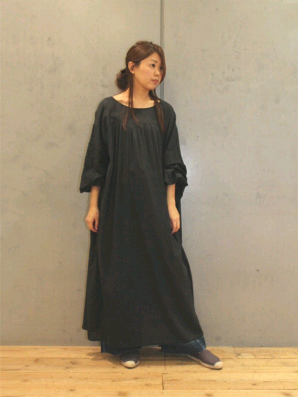 ナチュラルな雰囲気のロング丈ワンピ。 パンツと合わせるのがオススメ。