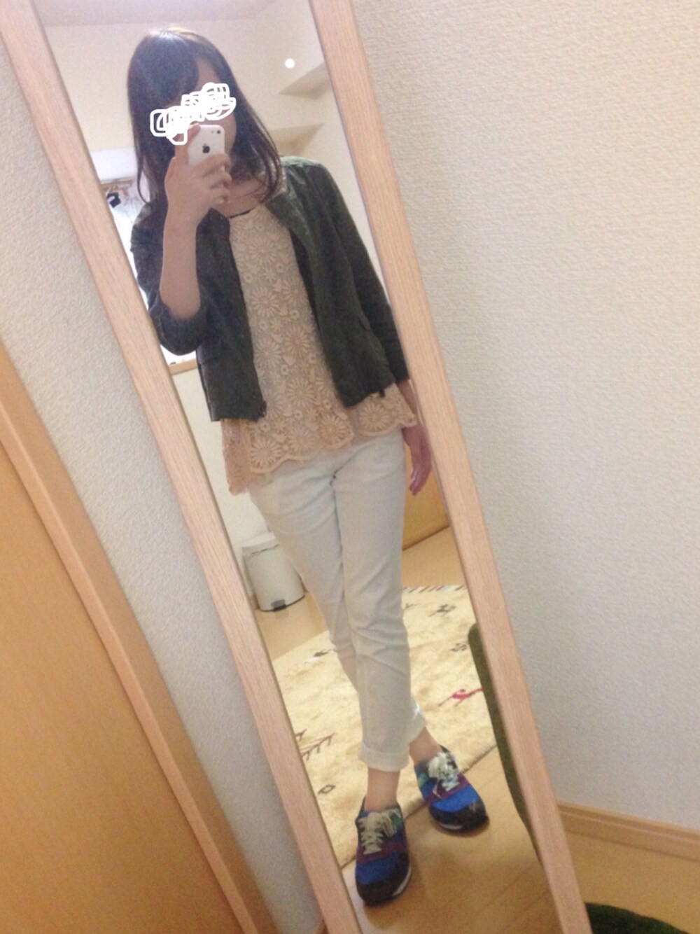 ジャケットは2way,お写真はパーカーを取り外したパターンです oliveのスニーカーは靴ひもを手芸屋さんで買ったりぼんにリメイクしてみました