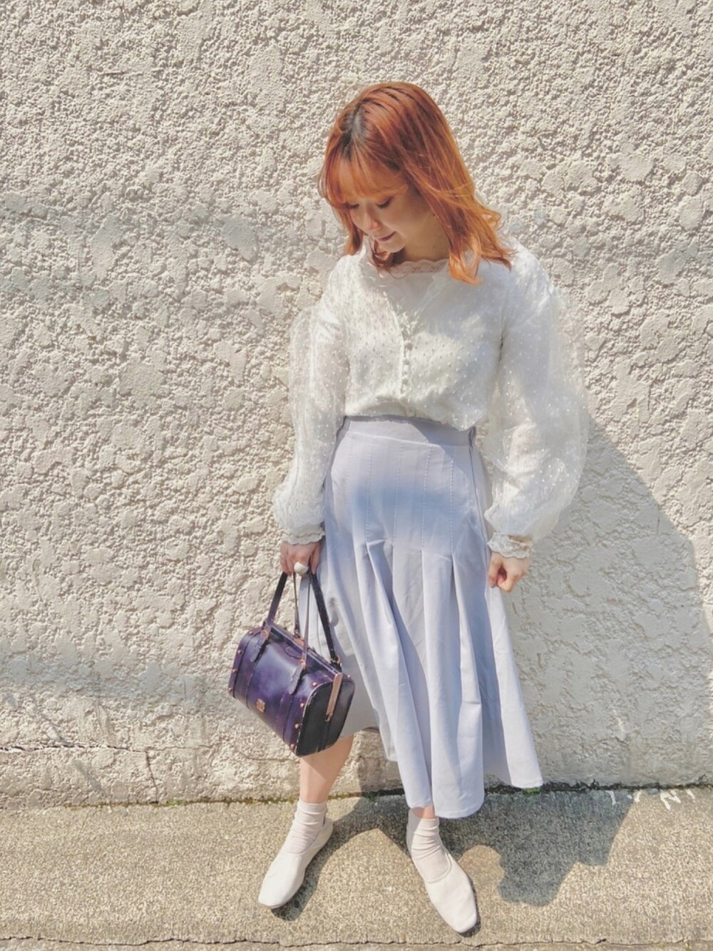 ドットシースルーのブラウスにアイスブルーのスカートで春らしいコーディネートに💓 今日はガーリーになりすぎず、大人っぽく💐