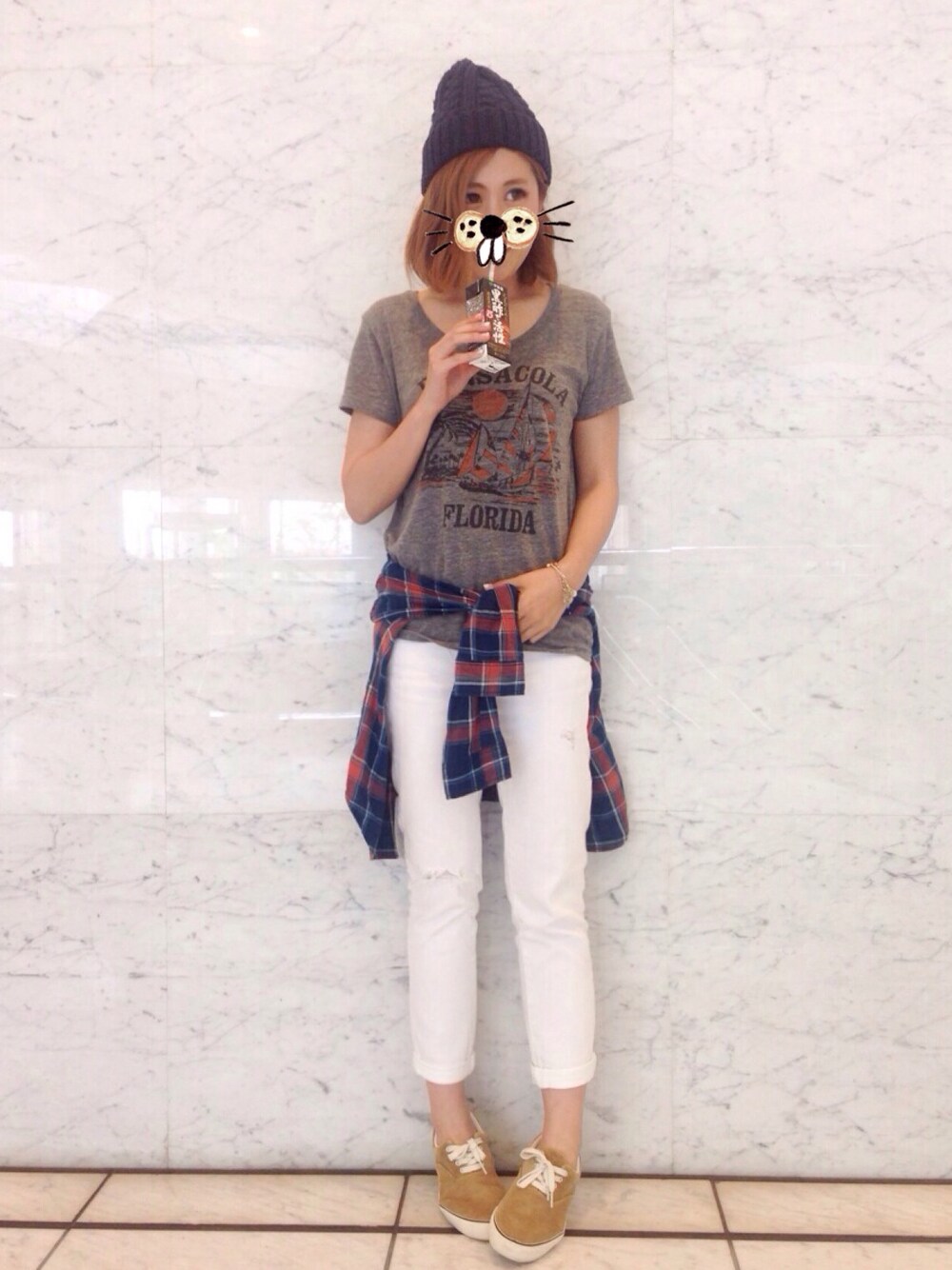 Tシャツ:moussy パンツ:GAP ネルシャツ:moussy スニーカー:moussy GAPのパンツは履き心地良くて、 ダメージ加工もしてあるから少しクールめのスタイルにもgood😊✌️ moussyのTシャツは古着っぽくて好き♡ 今年も夏はたくさんフェス行きたいな🎵