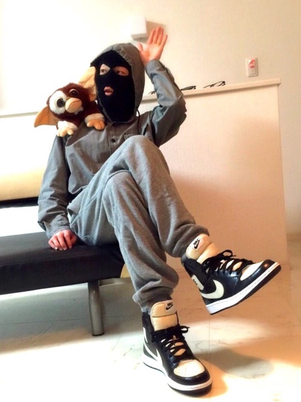 ニットキャップ KAPITAL シャツパーカー GU スウェットパンツ GAP スニーカー ナイキ ダイナスティ 004 ハイカット 後ろにかぶれば普通のニット帽だけど、たまには前にかぶって、下まで降ろすと、はい、強盗