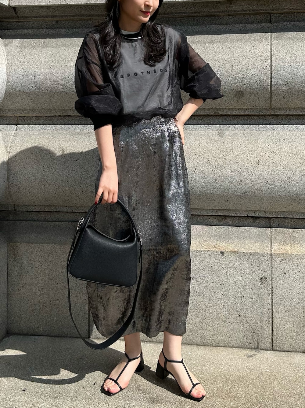 シアートップスにギラギラのグリッタースカートでシンプルだけどトレンド感あるコーデに🖤