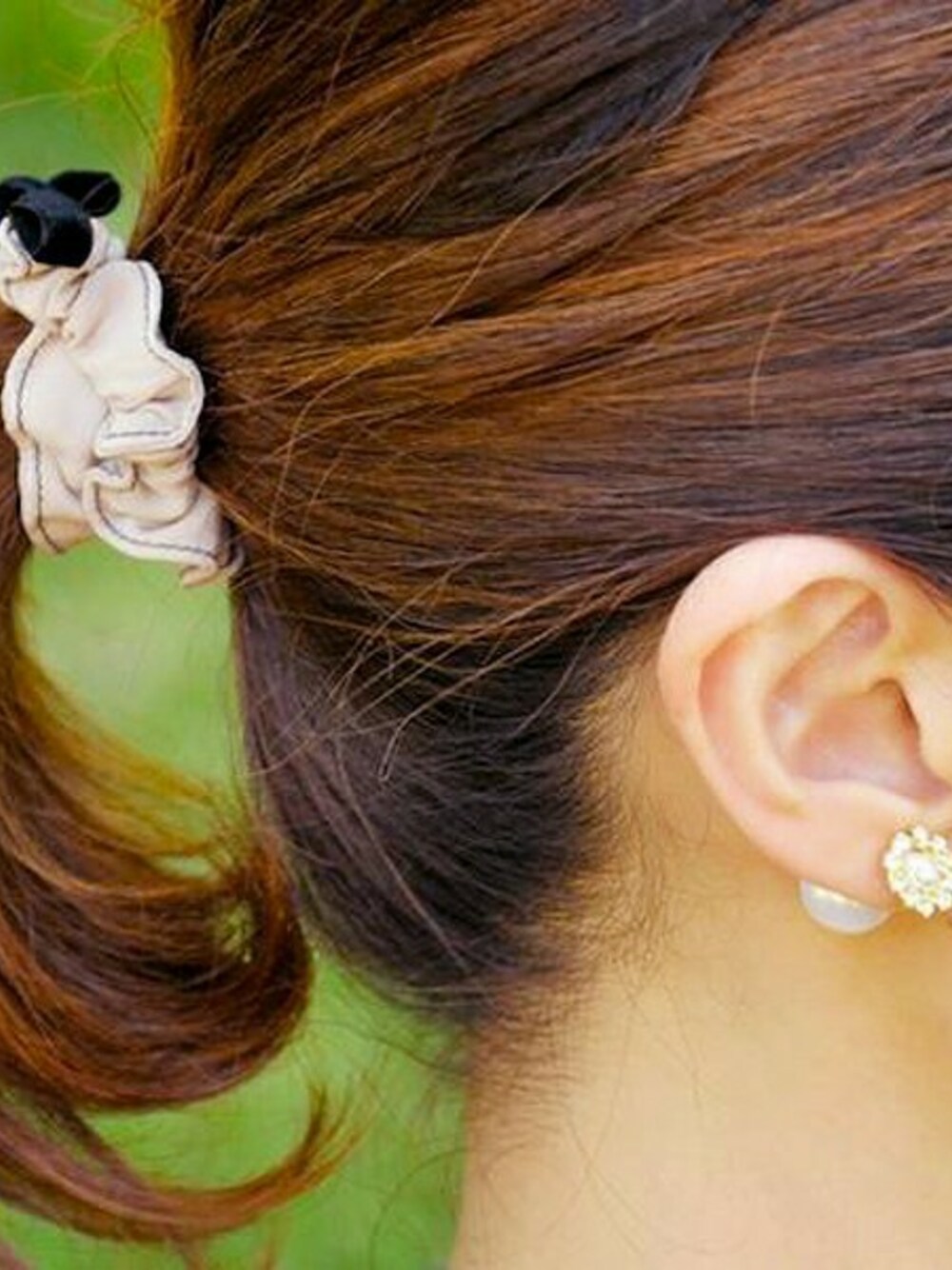 ビジューの片耳ピアスは、トレンドのパールキャッチに合わせてお花をイメージしてデザインしました。 ベルベットリボンのシュシュとの組み合わせで、秋冬っぽく。