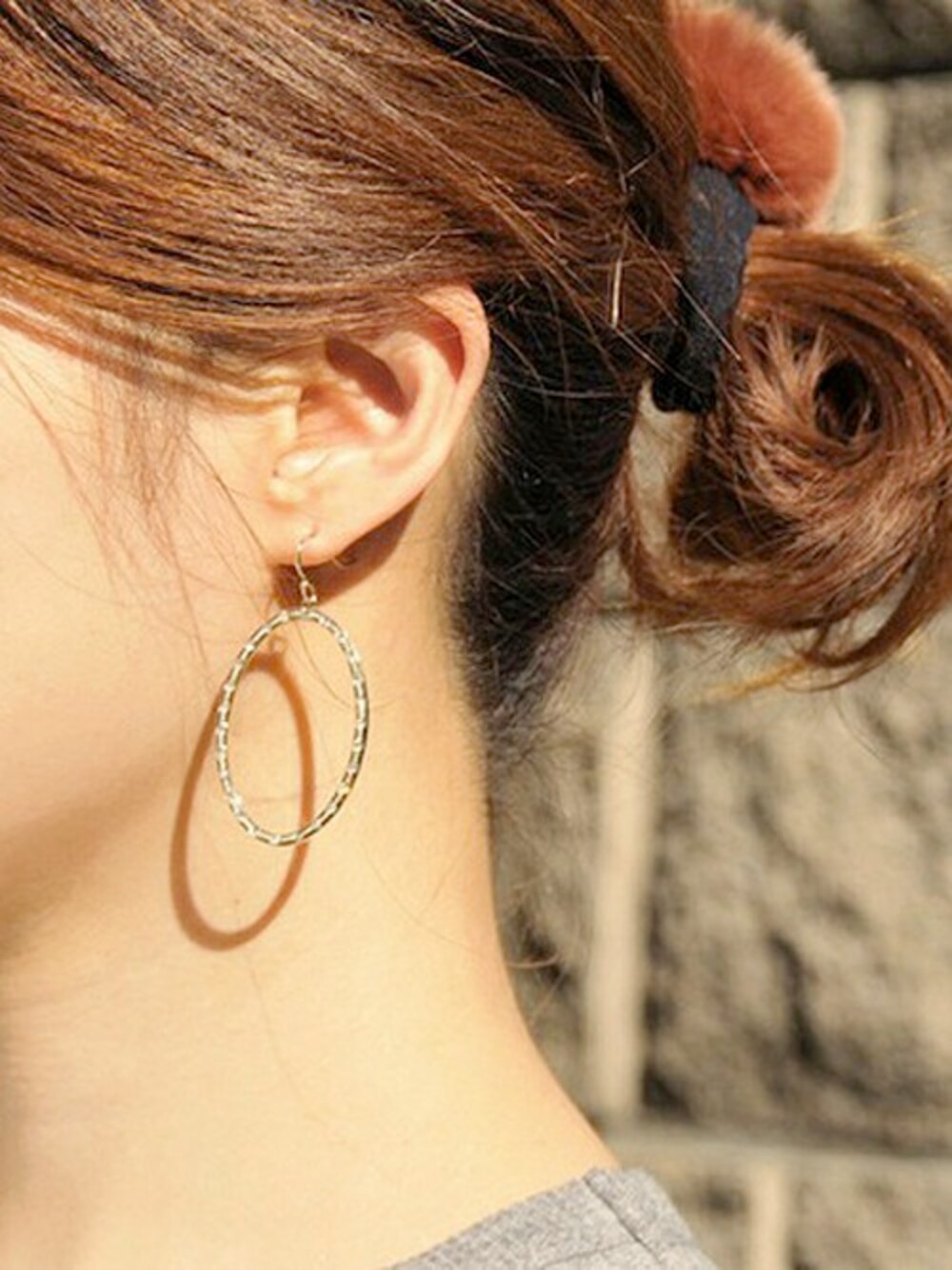 イタリアのコロッセオ(古代ローマ帝国の時代に闘技上として使っていた楕円刑のドーム)からインスピレーションを受けてデザインしたピアス。 表側と裏側のミル加工の施し方にもこだわったデザインは、高級感あふれる仕上がり。 ファーヘアゴムを使ったアップスタイルで、柔らかさをプラスして。