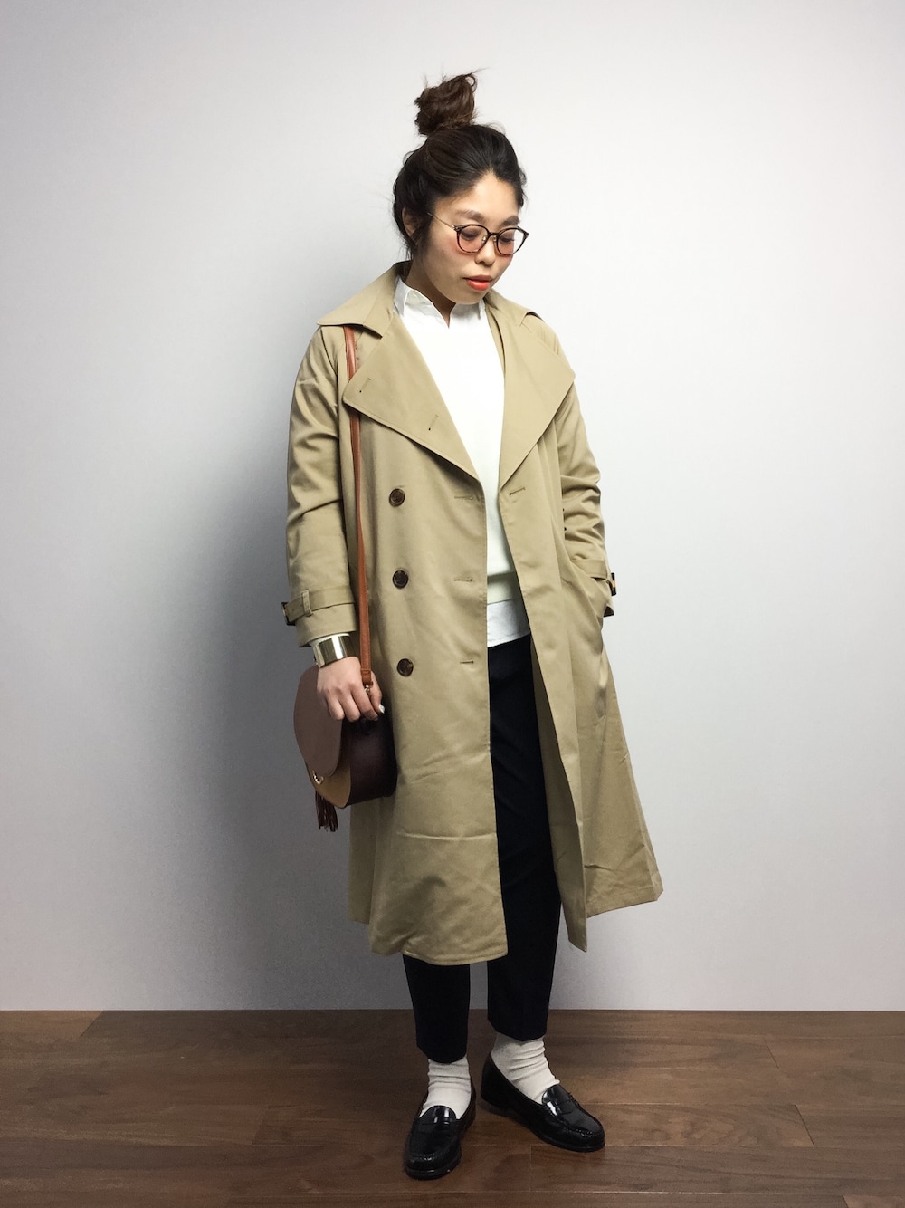 シンプルなアイテムでまとめた、大人カジュアルスタイル。 今回着用したトレンチコートは生地が薄手なので、春秋にオススメのアイテムです! 現在セールで10,800円と、アウターにしてはかなりお買い得です! 春のライトアウターとして買っておくのも良いですよ!